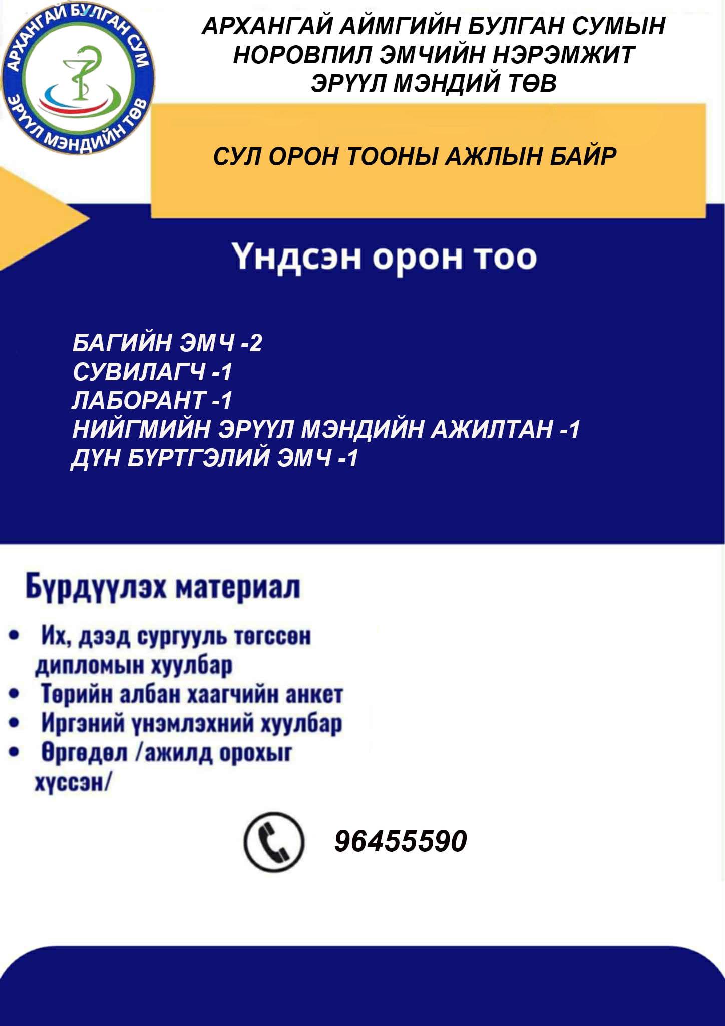 АРХАНГАЙ АЙМГИЙН БУЛГАН СУМЫН НОРОВПИЛ ЭМЧИЙН НЭРЭМЖИТ ЭРҮҮЛ МЭНДИЙН ТӨВ