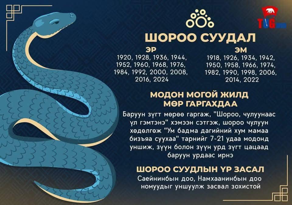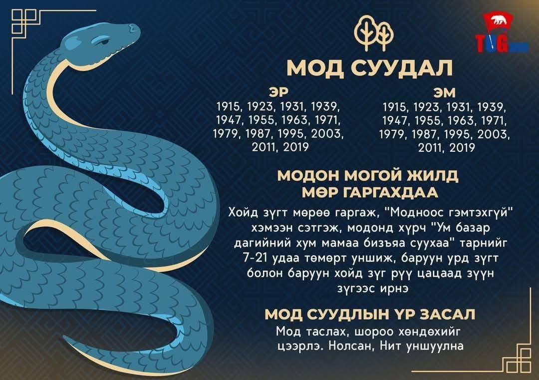Мод суудлын цээр: Энэ жилдээ мод огтлох, хутга мэсээр оролдох, хөх өнгийн эд авах, ирвэсний арьс авах, хэл ам, маргаан хийх, гөрөөсний мах идэхээс зайлсхийж яв. Бөс, илжиг, бух, ирвэс, барын арьс бүү ав. Элэг, цөс, гэдэс, яр түүхий, хөлний өвчнөөс сэрэмжил. Мод гөлөглөх, шарлах үеэр болгоомжил. Бич сард баруунаа барцадтай. Нохой сарын 22-нд баруун бар баруун хойд зүгт бүү яв.