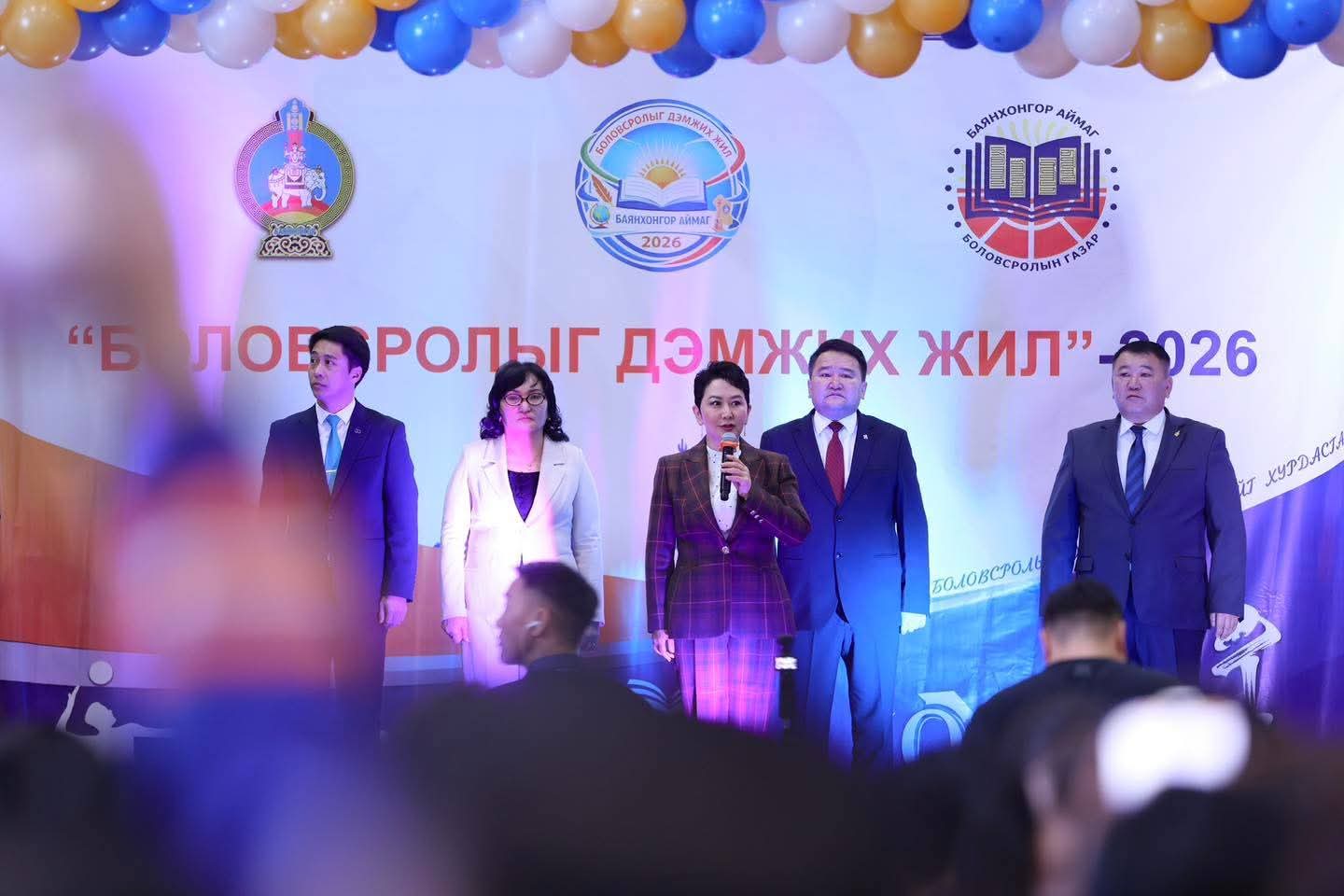 Боловсролыг дэмжих жилийн нээлт 2026.01.12-нд Баянхонгор аймагт болж УИХ-ын гишүүн, ЗГ-ын гишүүн, Гадаад харилцааны сайд Б.Батцэцэг, аймгийн ИТХ-ын дарга Б.Батсуурь, Засаг дарга Э.Энхбат, Боловсролыг дэмжих жилийн ажлыг хэрэгжүүлэх ажлын хэсгийн дарга буюу Засаг даргын орлогч Б.Наранбаяр нарын аймгийн удирдлагууд Монгол Улсын Гавьяат багш Ш.Чимгээ, Гавьяат багш Н.Цэвэлмаар болон Монгол Улсын зөвлөх багш нар, Боловсролын салбарын хамт олон өргөн дэлгэр оролцлоо.