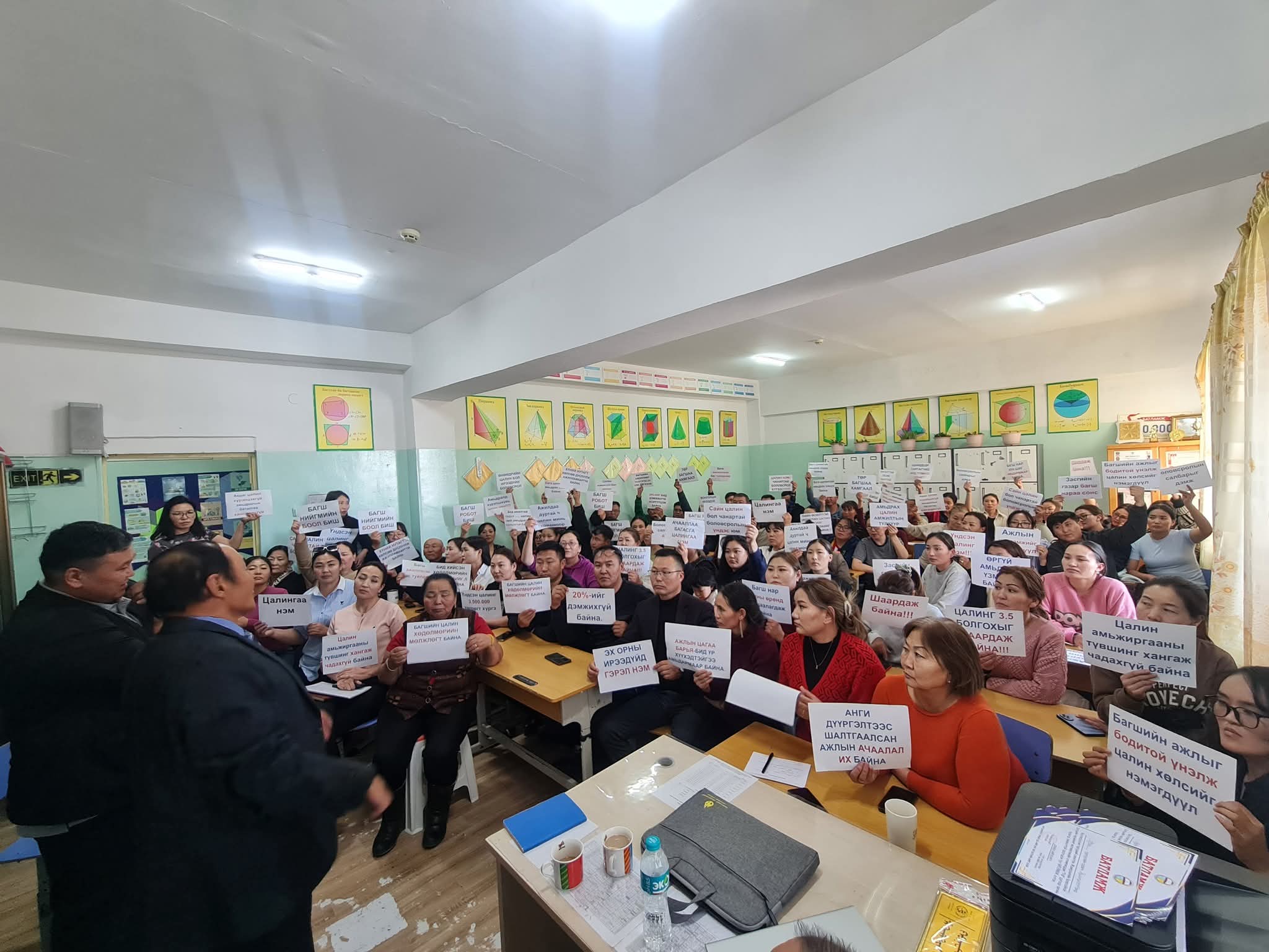 Баянхонгор аймгийн Эрдэм ахлах сургуулийн багш ажилтнууд ажил хаялтанд нэгдэж байна. | HuduuMN