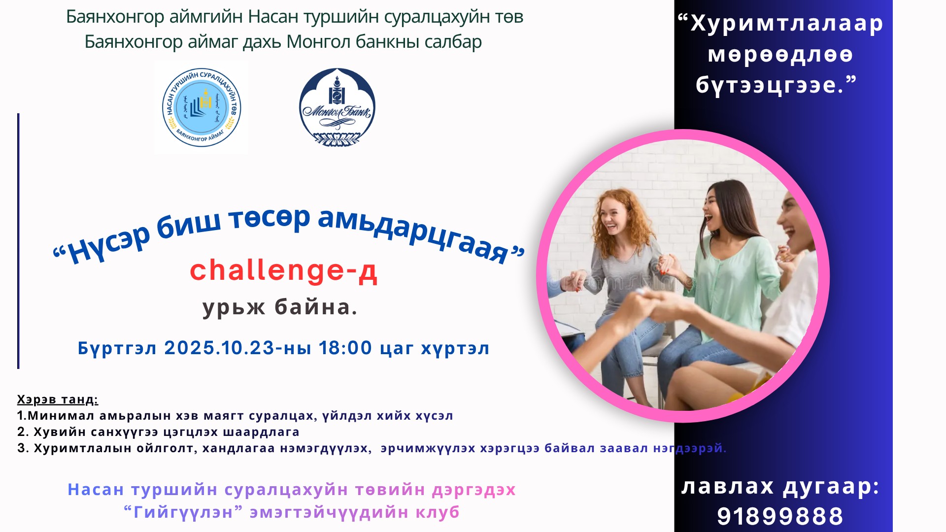 "Дэлхийн хуримтлалын өдөр-2025" аяныг тэмдэглэн өнгөрүүлэх ажлын хүрээнд "Нүсэр биш төсөр амьдарцгаая" челленжид нэгдэх хүсэлтэй бүсгүйчүүдээ урьж байна.