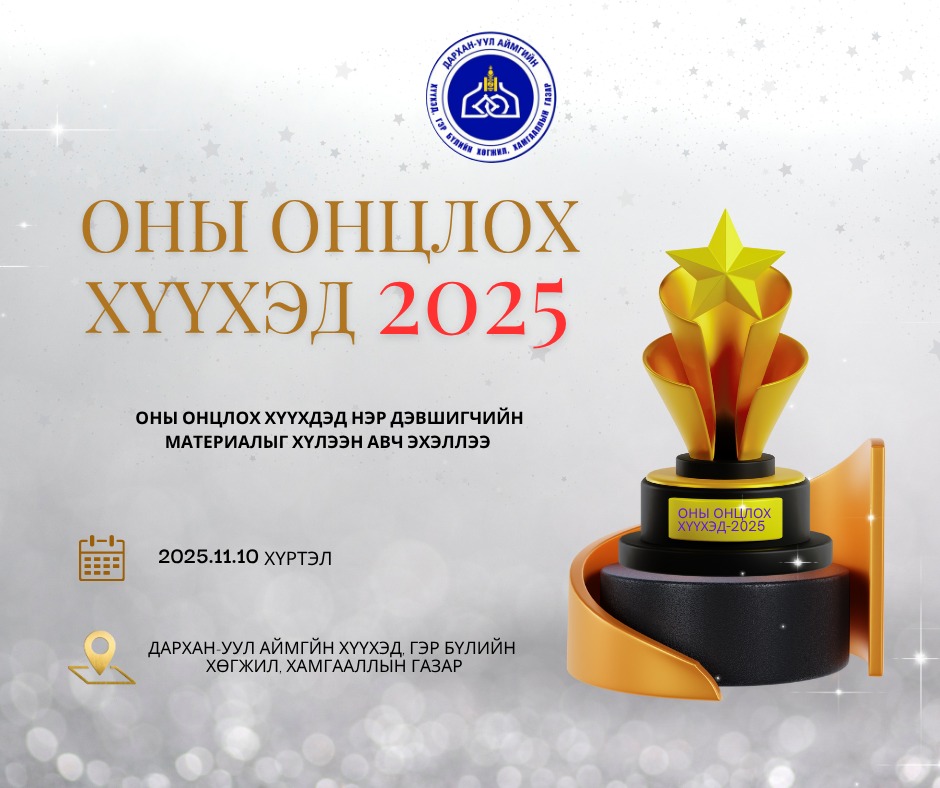 Материалыг 2025 оны 11-р сарын 10-ны өдөр хүртэл Дархан-Уул а аймгийн Хүүхэд, гэр бүлийн хөгжил, хамгааллын газрын 07 тоотод хүлээн авна. "2025 ОНЫ ОНЦЛОХ ХҮҮХЭД”-ийг 10 төрлөөр шалгаруулна.