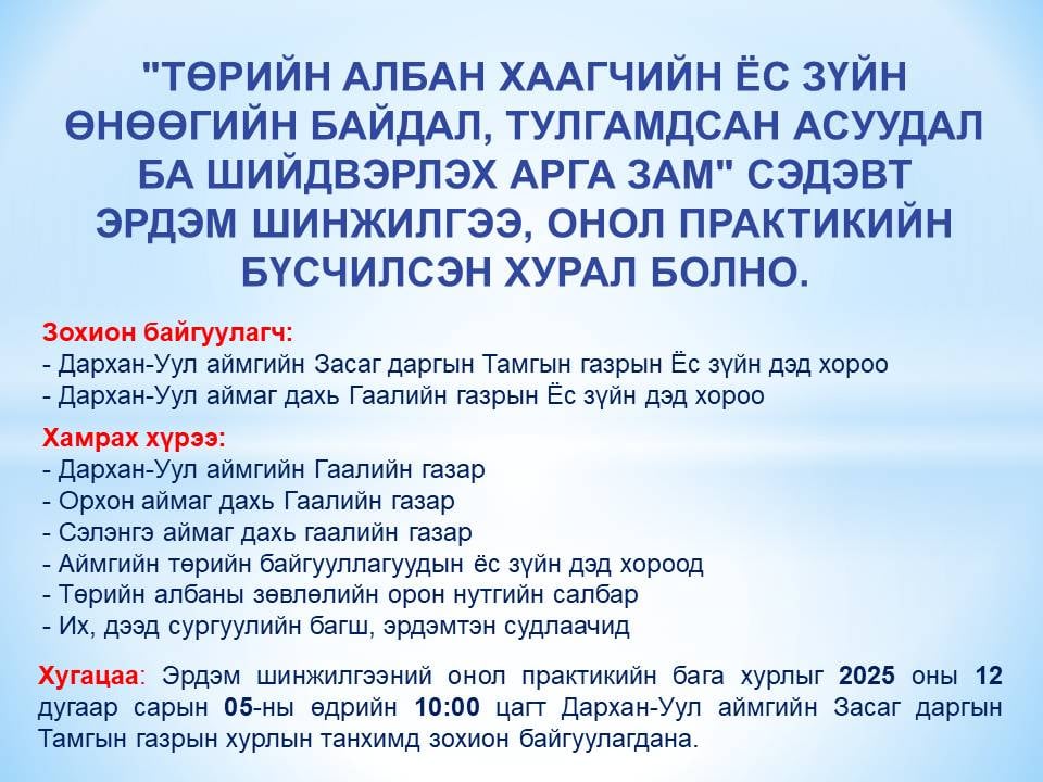 Эрдэм шинжилгээний онол практикийн бага хурлыг 2025 оны 12 дугаар сарын 05-ны өдрийн 10:00 цагт зохион байгуулагдана.