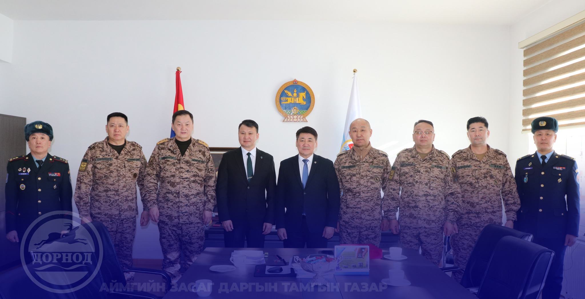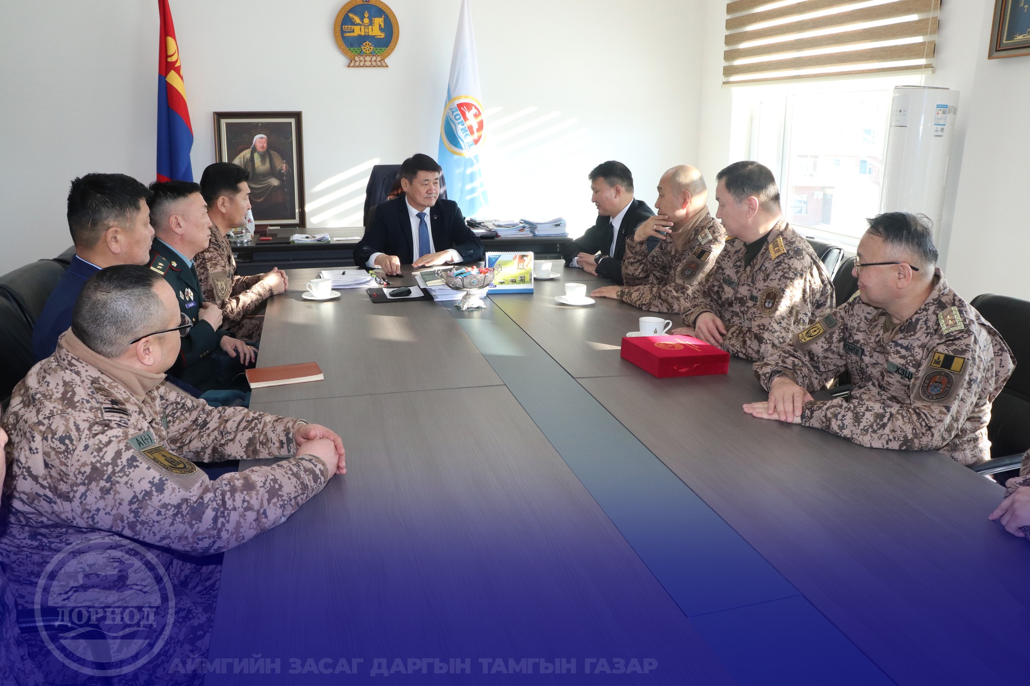 Өнөөдөр Батлан хамгаалахын дэд сайд Д.Баасандамба аймгийн Засаг орлогч Ч.Ганбаттай уулзаж Монгол Улсын Засгийн газраас дэвшүүлж буй зорилт, төрийн батлан хамгаалах бодлого, хүн төвтэй хөгжлийн агуулга, зорилго, мөн чанар, цэргийн алба хаагчийн нийгмийн баталгаа, хөгжлийн орчныг хангах талаар авч хэрэгжүүлж буй арга хэмжээний талаар танилцуулж, санал солилцлоо.