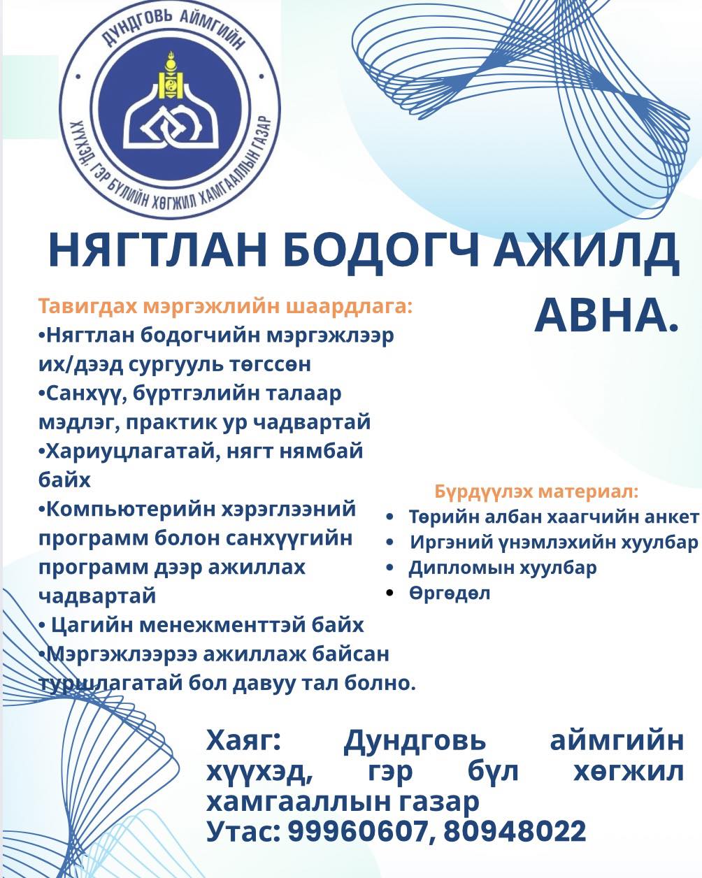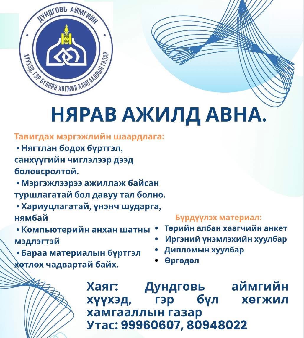 Аймгийн хэмжээнд төрийн захиргааны 119 сул орон тоо байгаагаас Удирдах албан тушаалын 6, гүйцэтгэх албан тушаалын 113 сул орон тоо байна. Сул орон тоо болон ажлын байранд тавигдах тусгай шаардлагуудын талаарх мэдээлэлтэй доорх QR-ийг уншуулан танилцана уу.