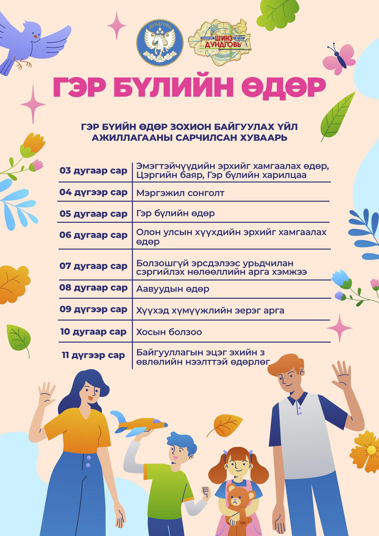 Аймгийн Засаг даргын 2026 оны 03 сарын 12-ны өдрийн А/152 дугаар захирамжаар “Гэр бүлийн өдөр болгох тухай” шийдвэрлэж, сар бүрийн эхний долоо хоногийн 5 дахь өдөр зохион байгуулах үйл ажиллагааны сарчилсан хуваарийг баталсан.