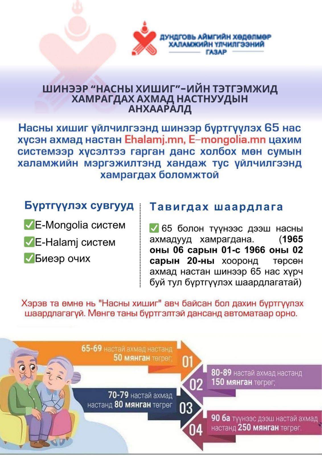 Монгол Улсын Засгийн газраас ахмад настнуудын нийгмийн баталгааг хангах зорилгоор олгодог 65 нас хүрсэн ахмад настны "Насны хишиг" үйлчилгээний шинэ ээлжийн бүртгэл эхэлсэн шаардлага хангасан иргэд бүртгэлээ хийлгээрэй