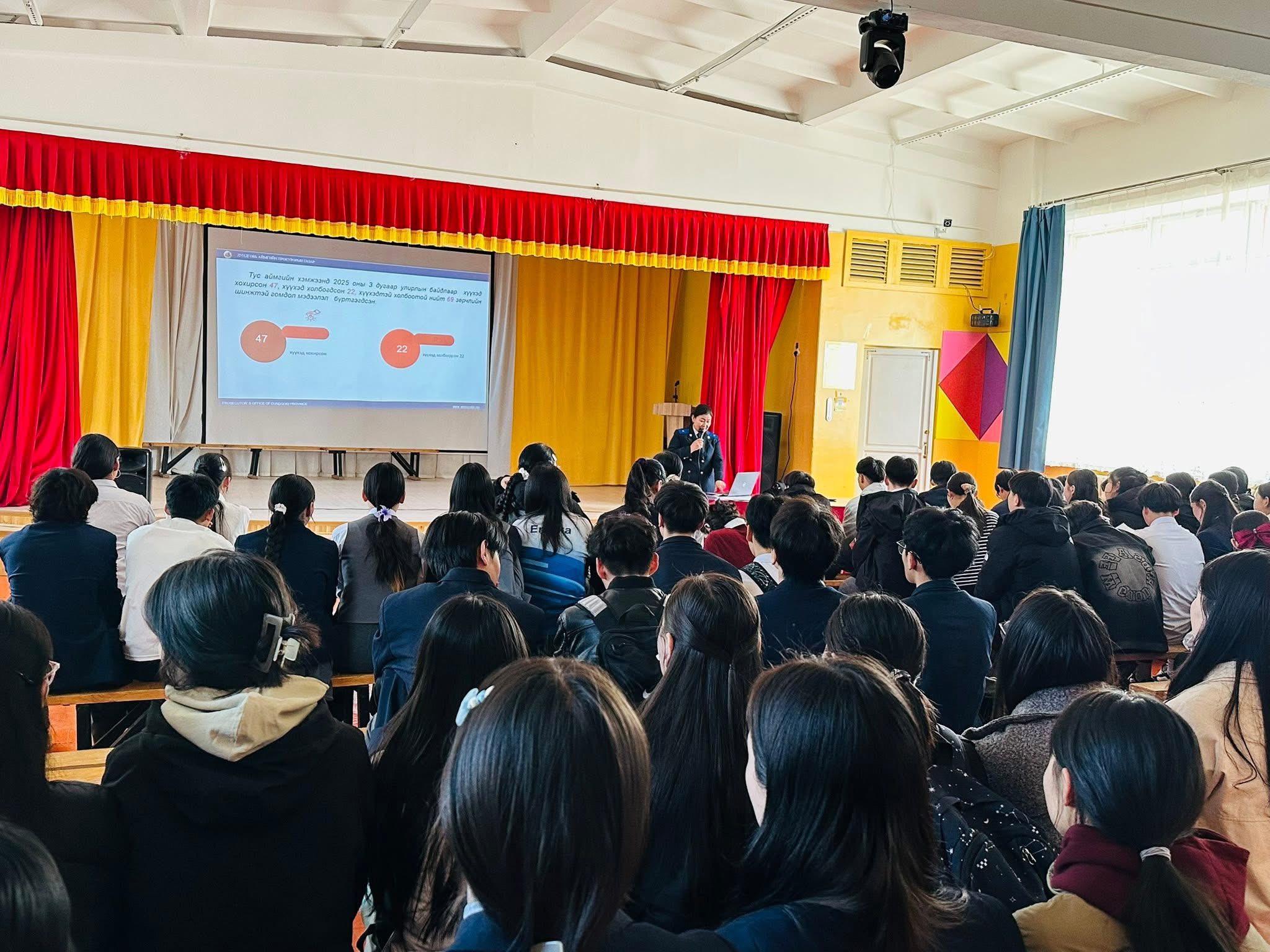 Тус сургалтыг Эрдмийн далай сургуулийн нийгмийн ажилтан Дундговь аймгийн Прокурорын газартай хамтран зохион байгуулж, 8-11 дүгээр ангийн нийт 371 сурагчийг хамрууллаа.