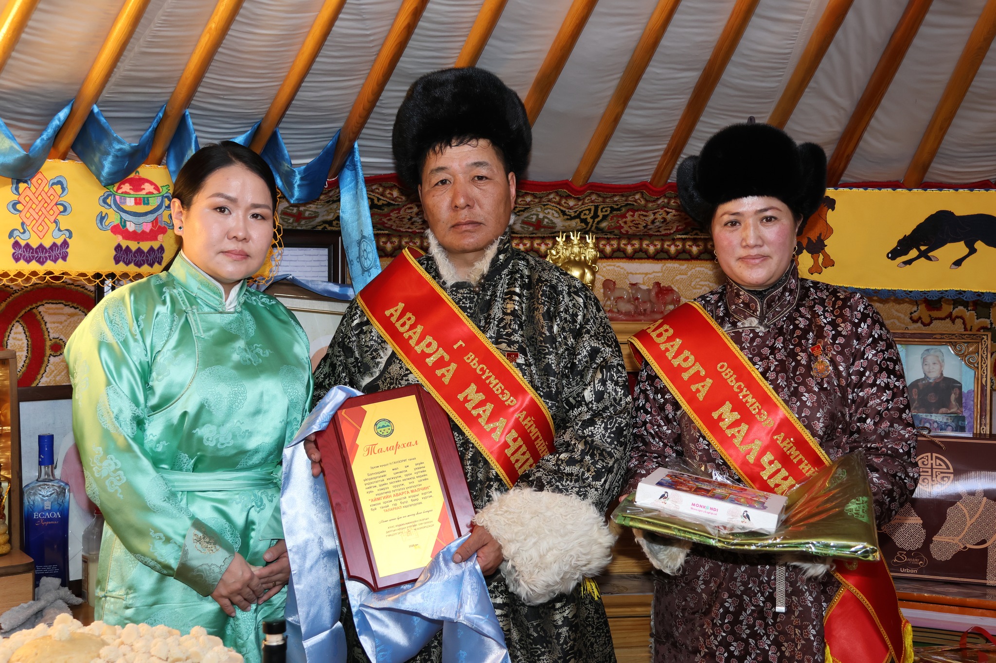 “XVII жарны ‘Сүрээр дарагч’ хэмээх Гал морин жилийн босгон дээр Говьсүмбэр аймгаас таван Аймгийн аварга малчин тодорсны нэгээр Шивээговь сумын Бэхт багийн малчин Наранбатын Ганзориг, Гончигийн Лхагвадулам нар шалгарлаа.