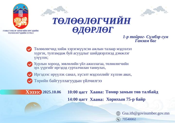 Аймгийн Иргэдийн Төлөөлөгчдийн Хурлаас "ТӨЛӨӨЛӨГЧИЙН ӨДӨРЛӨГ"-ийг хуваарийн дагуу зохион байгуулах гэж байгаа тул иргэд, албан байгууллагуудыг идэвхитэй оролцохыг уриалж байна.