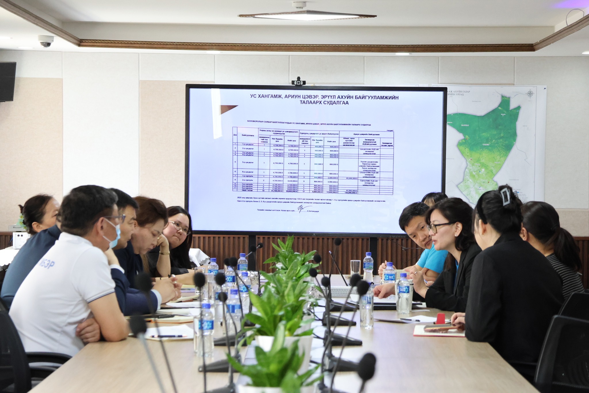Уулзалтад аймгийн Засаг даргын орлогч Б.Наранбаатар, Нийгмийн бодлогын хэлтсийн дарга Г.Болортуяа болон холбогдох салбарын дарга нар болон мэргэжилтнүүд оролцсон ба уулзалтын үеэр ундны усны асуудал, цаашид хийж хэрэгжүүлэх ажил, үйлчилгээний талаар санал солилцов.