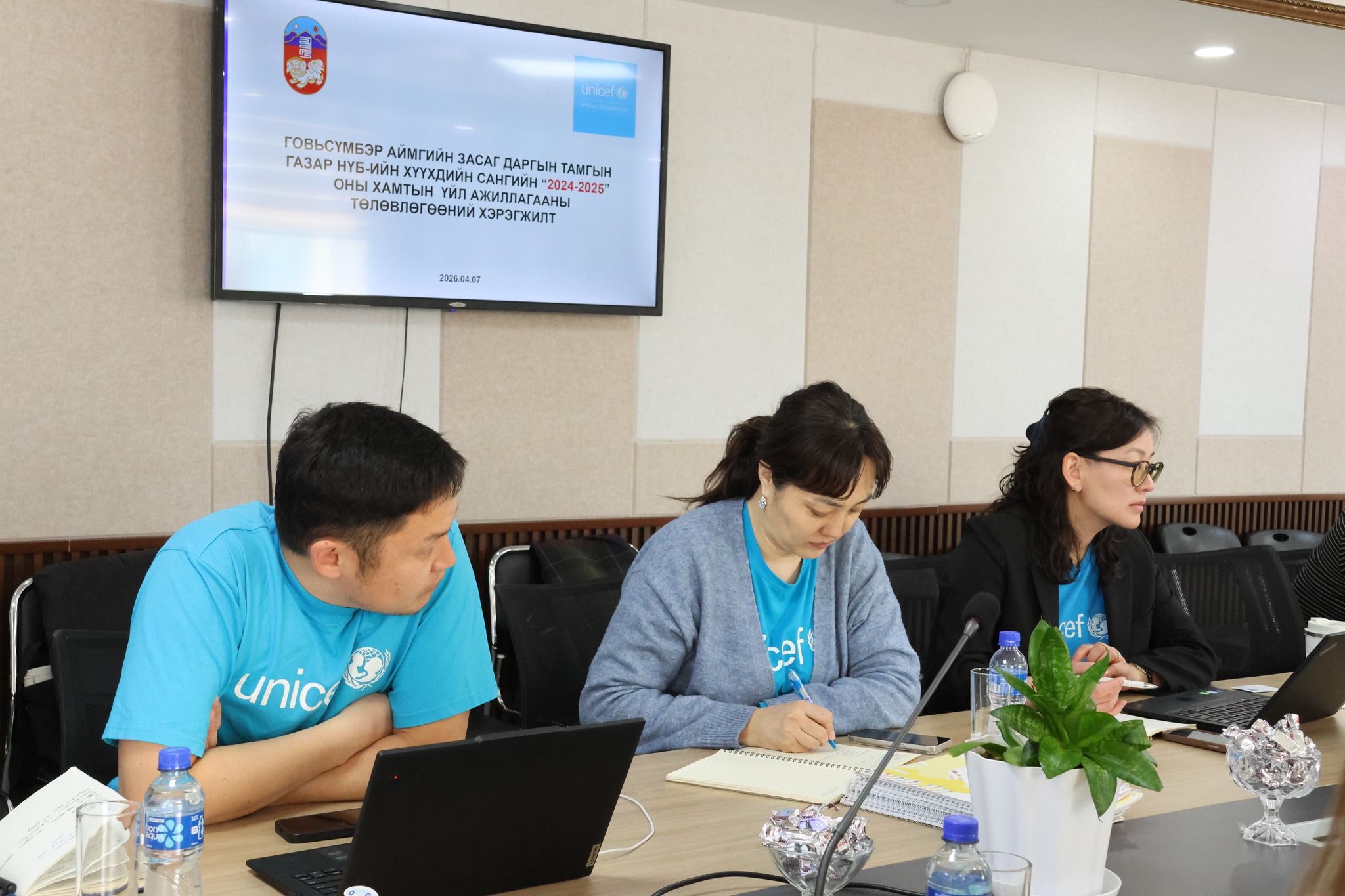 НҮБ-ын Хүүхдийн сангийн (UNICEF) төлөөлөгчид болох Д.Ариунтунгалаг, С.Өлзийсайхан, Б.Баттөмөр нар 2026 оны 04 дүгээр сарын 08-ны өдөр 2024-2025 онд хамтран ажиллах үйл ажиллагааны төлөвлөгөөний хүрээнд эрүүл мэнд, сургуулийн өмнөх боловсрол, хүүхэд хамгаалал, уур амьсгалын өөрчлөлт зэрэг дөрвөн чиглэлийн хэрэгжүүлсэн төслүүдийн үр дүнг хянах, нөхцөл байдлын үнэлгээний дараагийн алхмын талаар хэлэлцэх зорилгоор уулзалт зохион байгууллаа.