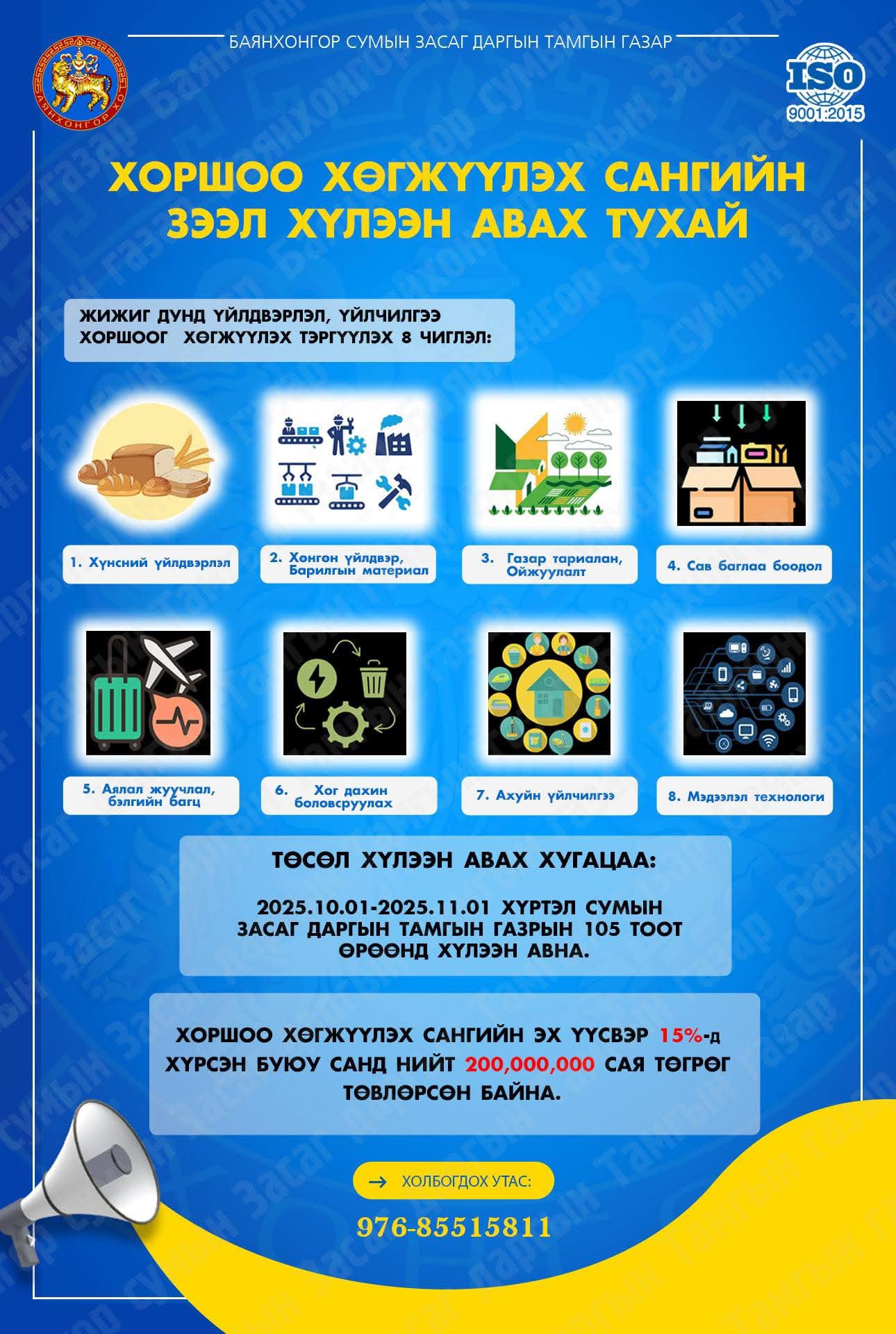 Баянхонгор сумын Хоршоо хөгжүүлэх сангийн зээлийн хүсэлтийн материалыг 2025.10.01-2025.11.01 хүртэлх хугацаанд хүлээн авна.