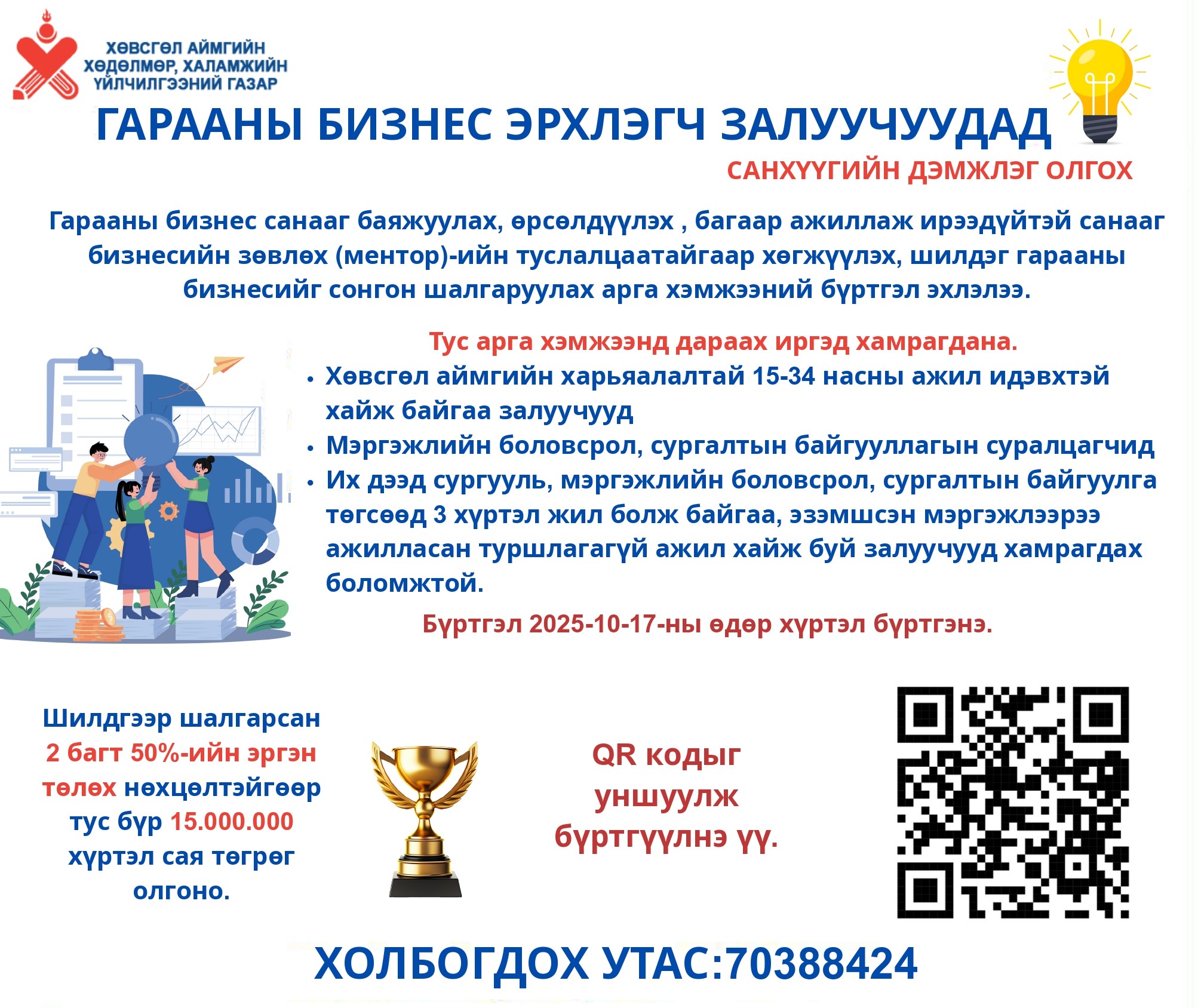 арааны бизнес эрхлэгч залуучуудад санхүүгийн дэмжлэг олгох✅ Бүртгэлийн линк: https://forms.gle/YRWXFd4JQjPXDfer6 📅2025 оны 10 дугаар сарын 17-ны өдрийг хүртэл сунгалаа.