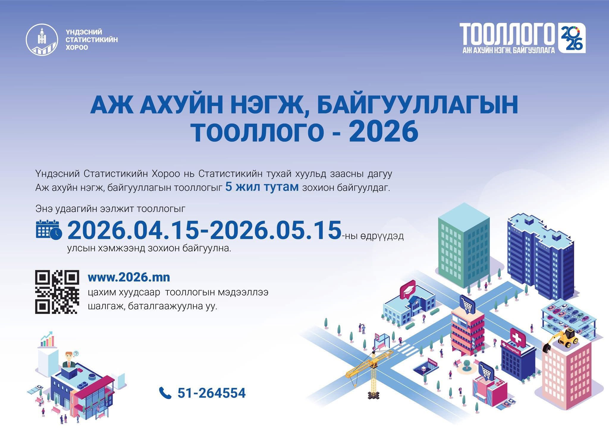 Аж ахуйн нэгж, байгууллагын ээлжит тооллого эхэллээ Үндэсний статистикийн хорооноос 5 жил тутам зохион байгуулдаг “Аж ахуйн нэгж, байгууллагын ээлжит тооллого”-ыг энэ жил бүртгэлд суурилсан аргаар улсын хэмжээнд зохион байгуулж байна. Тооллого нь өнөөдрөө | HuduuMN