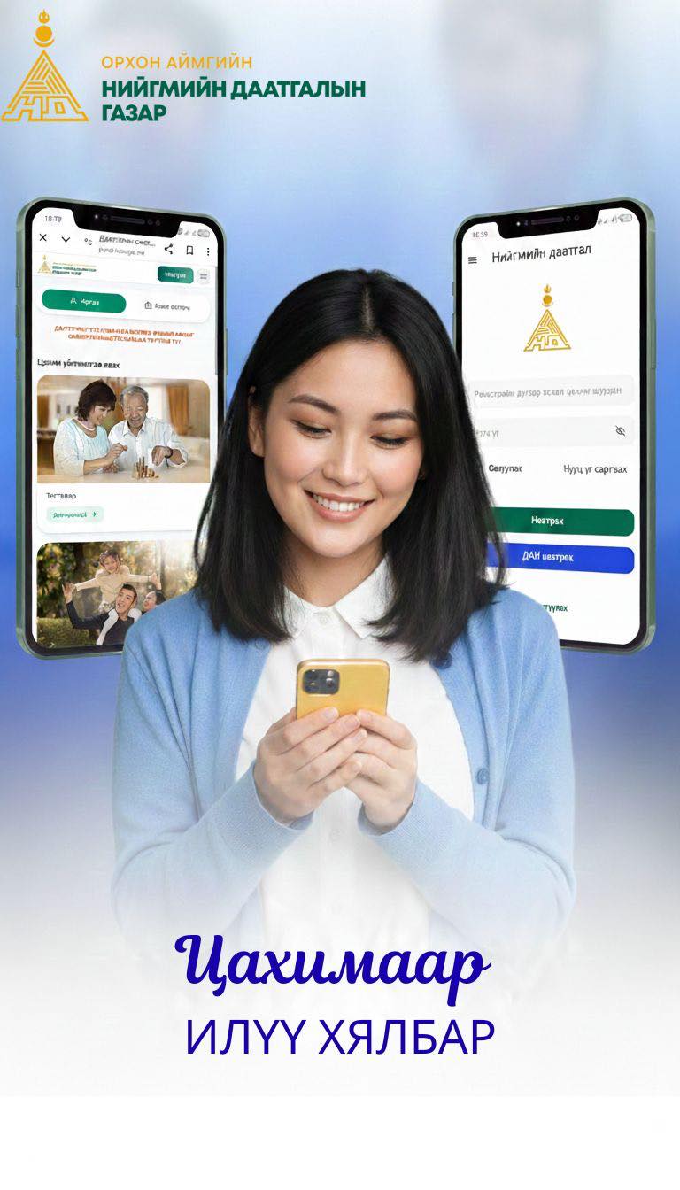 Даатгуулагч та дараах цахим сувагт хандаж нийгмийн даатгалын үйлчилгээ аваарай ✅Нийгмийн даатгалын үйлчилгээний цахим систем portal.ndaatgal.mn  ✅"Нийгмийн даатгал" гар утасны аппликейшн  ✅Төрийн үйлчилгээний цахим систем e-mongolia.mn | HuduuMN