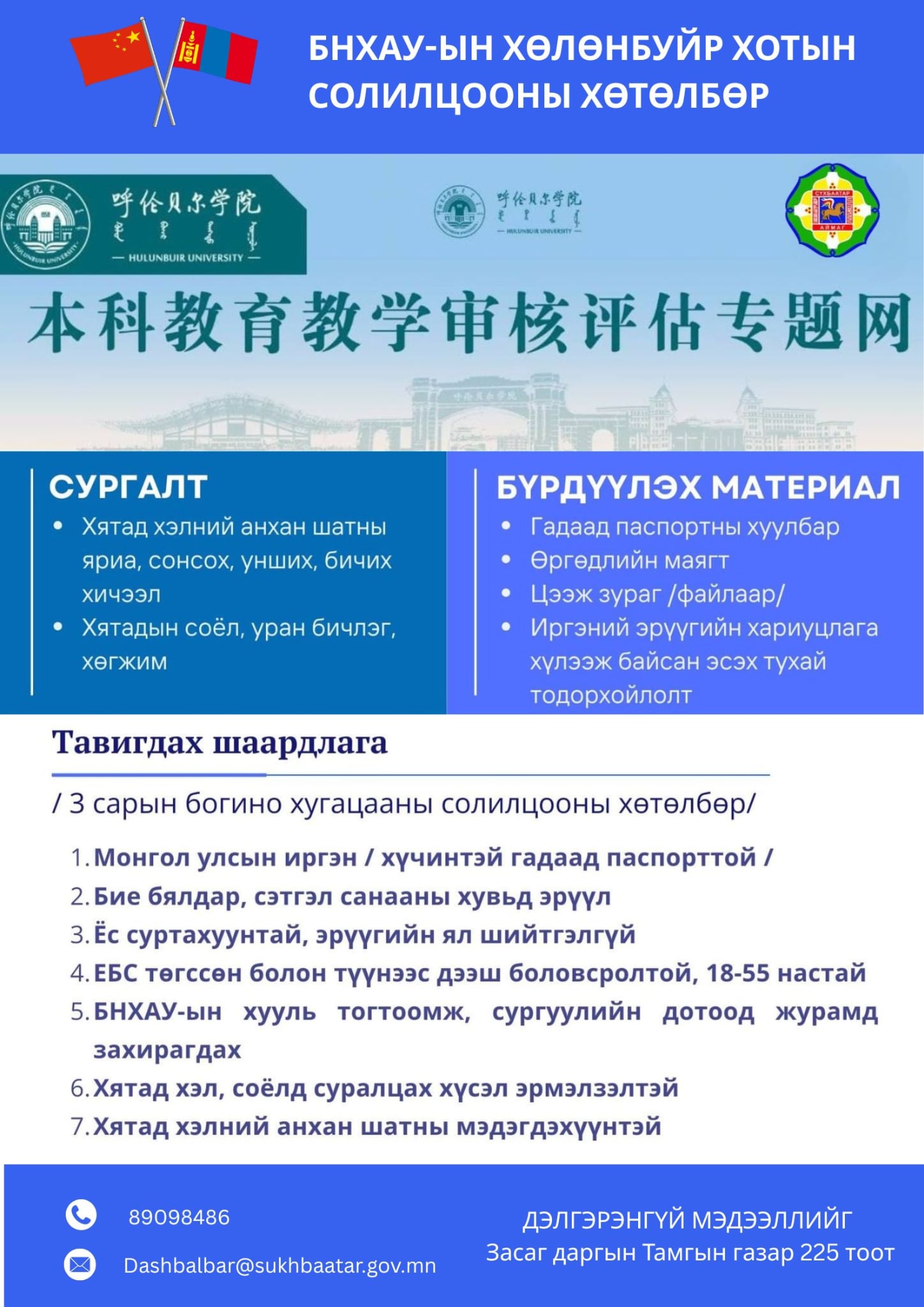 ГАДААД СОЛИЛЦООНЫ ХӨТӨЛБӨРИЙН БҮРТГЭЛ ЭХЭЛЛЭЭ  БНХАУ-ын ӨМӨЗО-ны Хөлөнбуйр хот болон Сүхбаатар аймаг хоорондын боловсрол, соёлын хамтын ажиллагааг гүнзгийрүүлэх зорилгоор Хөлөнбуйрын Их Сургуульд 2026 онд богино хугацааны хөтөлбөрт хамрагдах 5 орон тоо за | HuduuMN