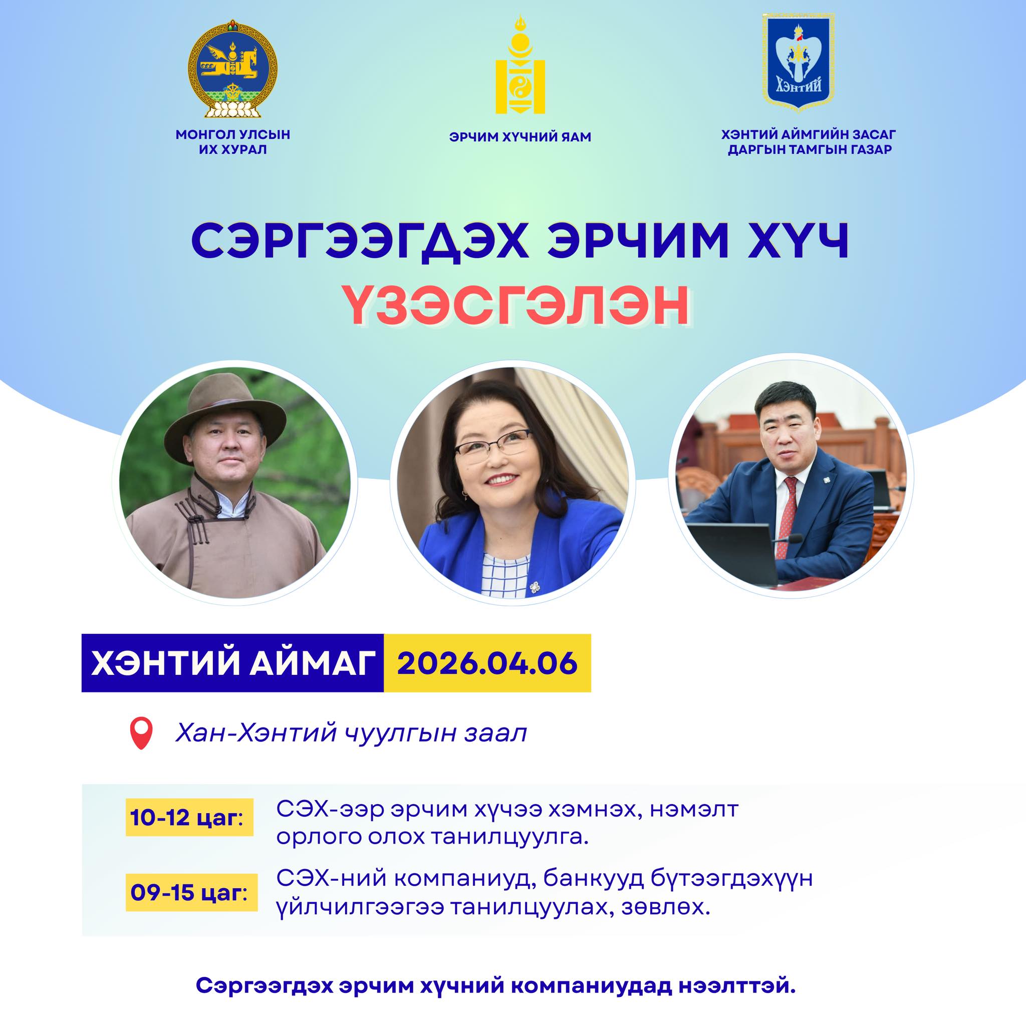 Ирэх дөрөвдүгээр сарын 6-ны өдөр Хан Хэнтий чуулгад "СЭРГЭЭГДЭХ ЭРЧИМ ХҮЧ"-ний талаарх танилцуулга, бүтээгдэхүүн үйлчилгээний үзэсгэлэн болох тул иргэд, ААН-үүдийг урьж байна. 2026.04.02