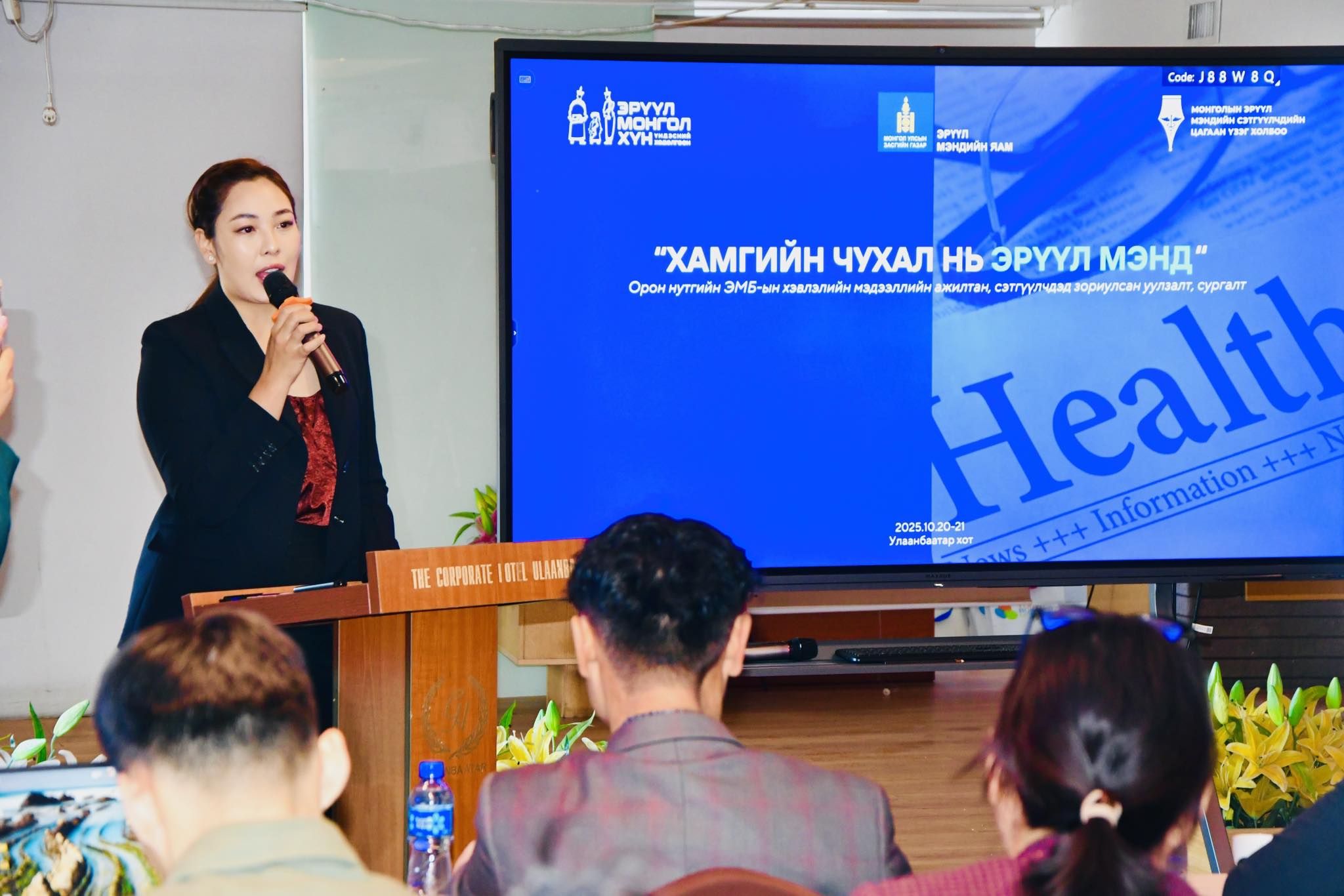 "ХАМГИЙН ЧУХАЛ НЬ ЭРҮҮЛ МЭНД" ТЭТГЭЛЭГТ СУРГАЛТ БОЛЖ БАЙНА "Эрүүл Монгол хүн” үндэсний хөдөлгөөний нийтийн эрүүл мэндийг дэмжих ажлын хүрээнд орон нутгийн эрүүл мэндийн байгууллагын хэвлэл мэдээллийн ажилтан болон сэтгүүлчдэд зориулсан эрүүл мэндийн мэдээ 2025.10.20