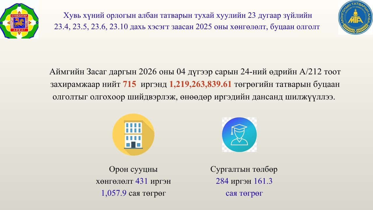 Хувь хүний орлогын албан татварын тухай хуульд заасны дагуу аймгийн Засаг даргын 2026 оны 04 дүгээр сарын 24-ний өдрийн А/212 тоот захирамжаар нийт 715 иргэнд 1,219,263,839.61 төгрөгийн татварын буцаан олголтыг олгохоор шийдвэрлэж, өнөөдөр иргэдийн данса