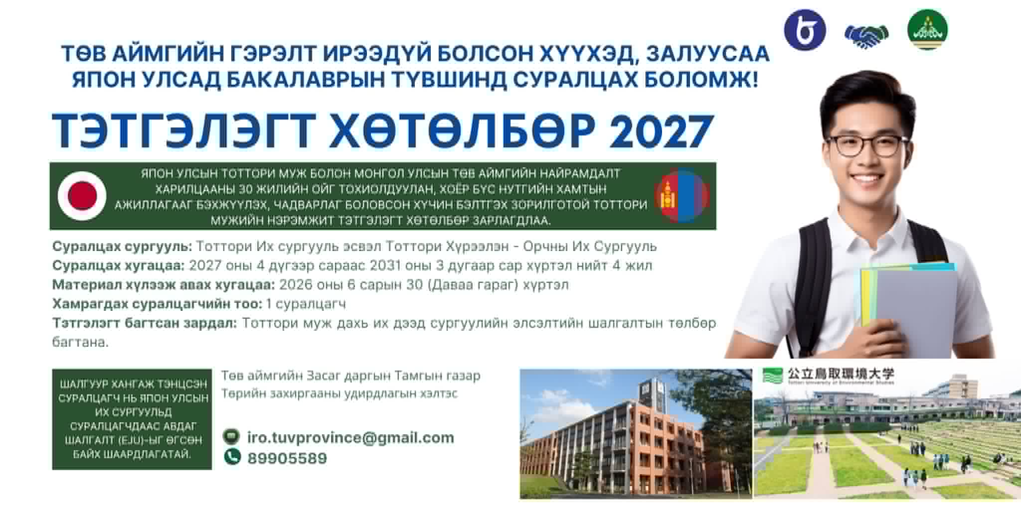 Япон улсын Тоттори мужийн их, дээд сургуульд бакалаврын түвшинд суралцах тэтгэлэг зарлагдлаа | HuduuMN