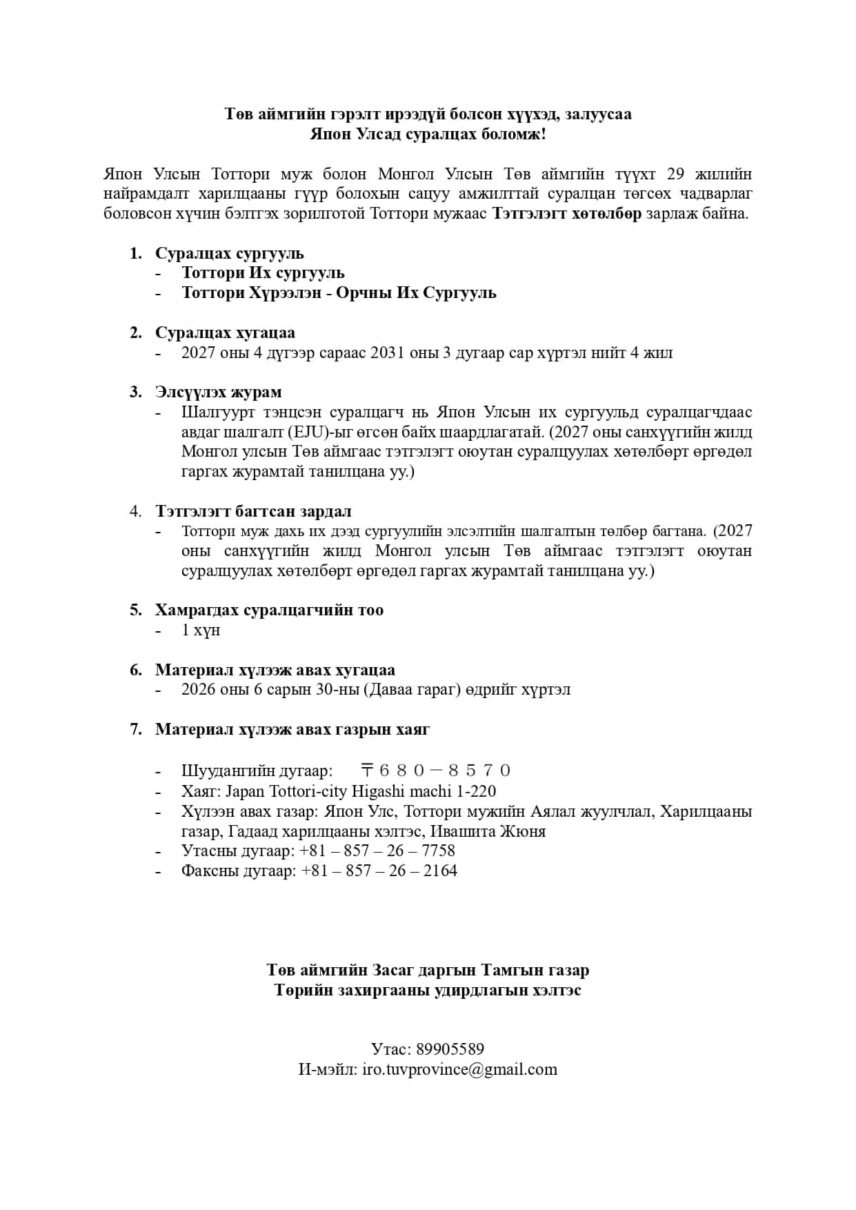 Япон улсын Тоттори мужийн их, дээд сургуульд бакалаврын түвшинд суралцах тэтгэлэг зарлагдлаа