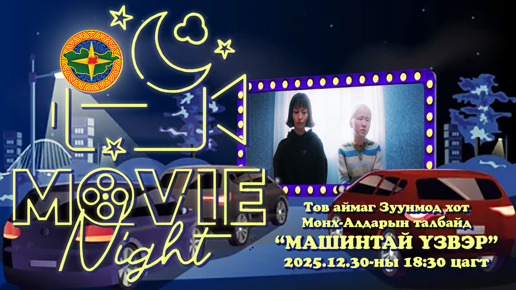 "Мөнгөн үдэш-2025" шинэ жилийн баярын хүрээнд Зуунмод хотын Мөнх-Алдарын талбайд MOVIE NIGHT буюу машинтай кино үзвэрийн үдэш болох тул иргэд та бүхэн гэр бүл, найз нөхөдтэйгээ машиндаа кино үзэж, дурсамж бүтээгээрэй.