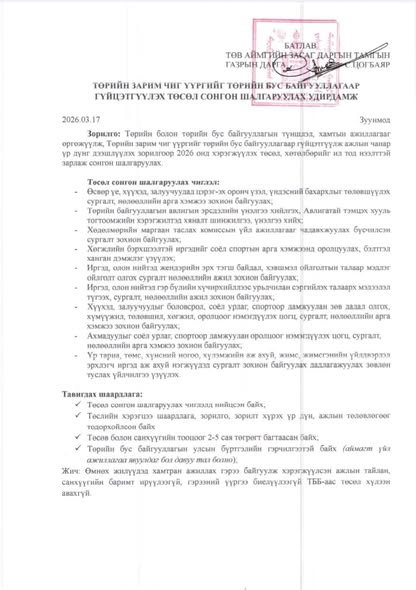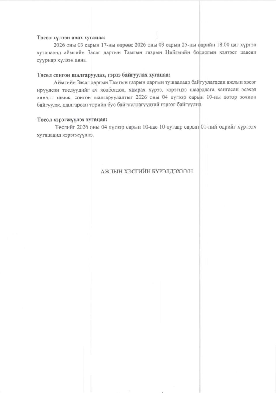 Төслийг 2026 оны 03 сарын 17-ны өдрөөс 2026 оны 03 сарын 25-ны өдрийн 18:00 цаг хүртэл хугацаанд аймгийн Засаг даргын Тамгын газрын Нийгмийн бодлогын хэлтэст цаасан сууриар хүлээн авна.