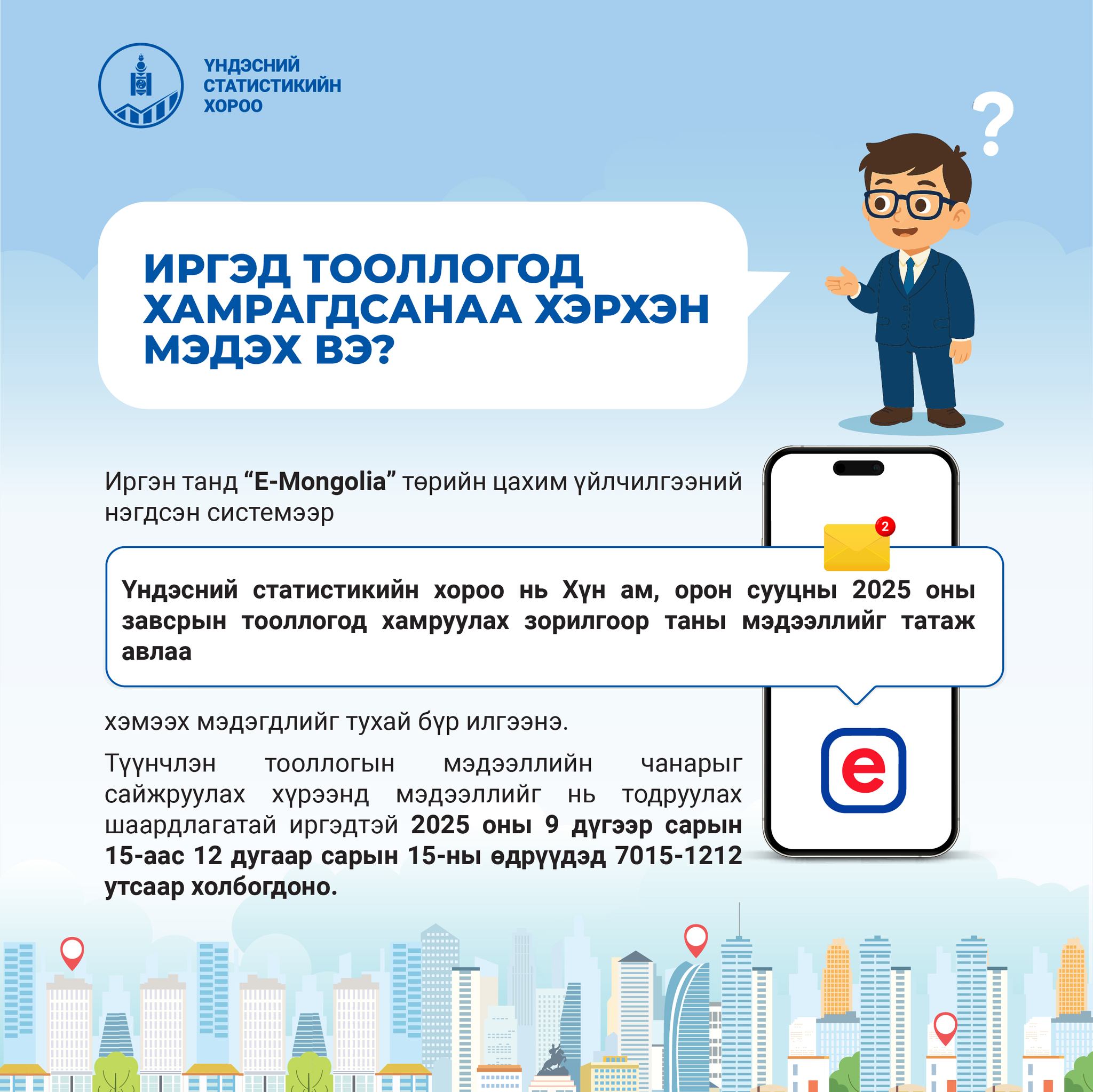 2025 оны завсрын тооллогод хамрагдахдаа http://2025.mn холбоосоор нэвтэрч, хувь хүний болон өрхийн мэдээллээ шалгаарай.