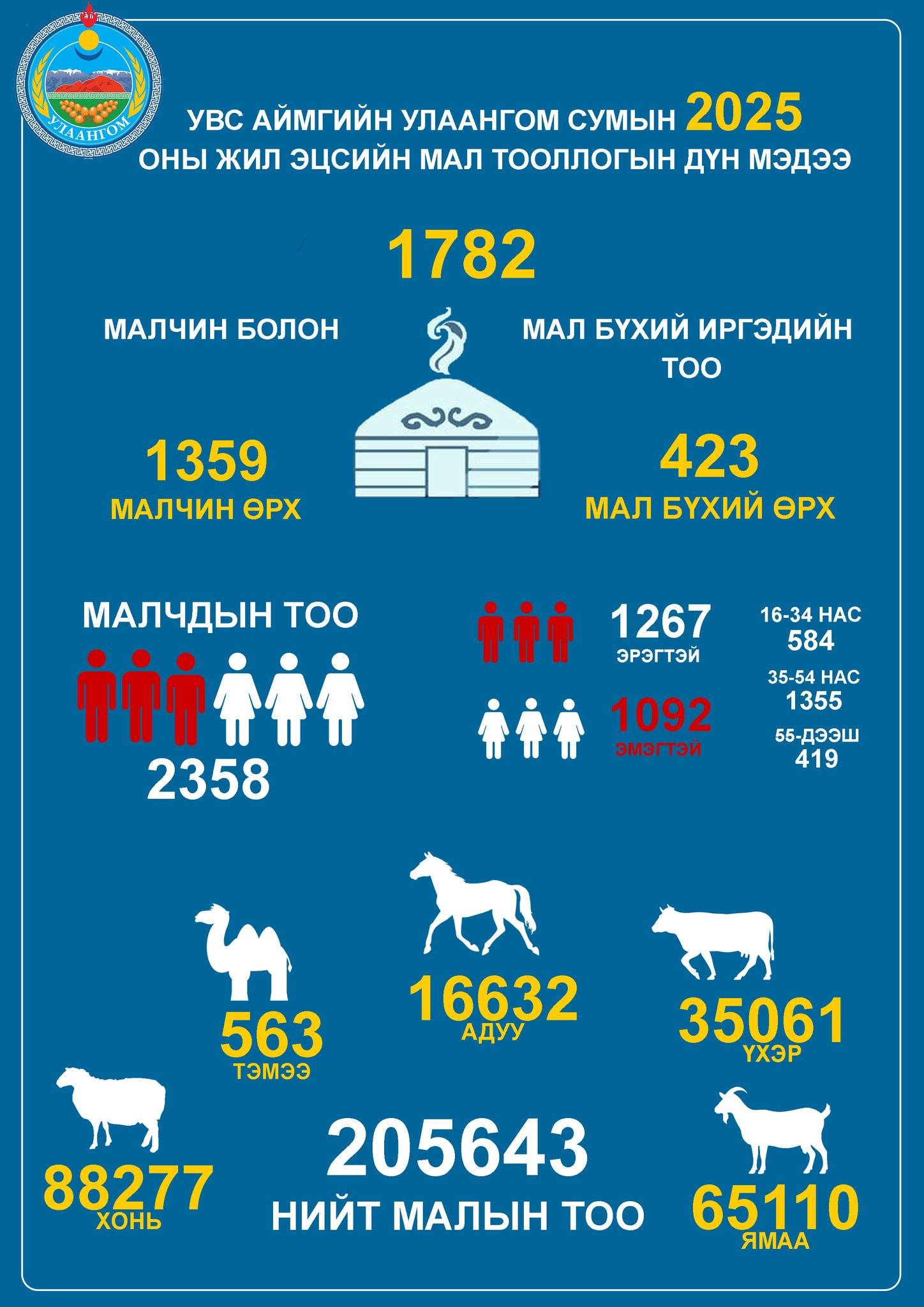 УВС АЙМГИЙН УЛААНГОМ СУМЫН 2025 ОНЫ ЖИЛ ЭЦСИЙН МАЛ ТООЛЛОГЫН ДҮН МЭДЭЭ ✅ Нийт 205643 толгой мал тоолуулсанаас өнгөрсөн жилийн малын тоотой харьцуулбал 22491 толгой мал буюу 10 % -иар буурсан үзүүлэлт гарсан байна.